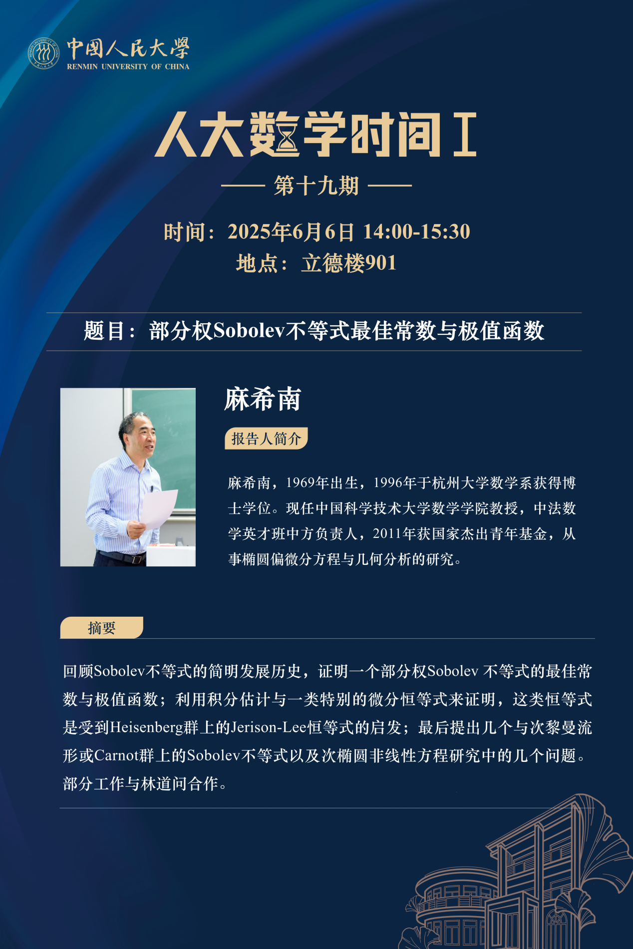 为促进学科交流融合、拓宽师生学术视野、释放科研创新活力,助力人大数学学科走向一流,伟德victor1946网站设立“人大数学时间”,以专题研讨、高端学术论坛为载体,搭建数学思想充分碰撞、优秀人才不断涌流、创造活力竞相迸发的舞台。“人大数学时间”将持之以恒,久久为功,立志通过交流与创新、提出重大问题,引领数学学科及相关领域的创新与发展,成为对我国数学发展有贡献意义的平台。以下为“人大数学时间I”第十九期信息: