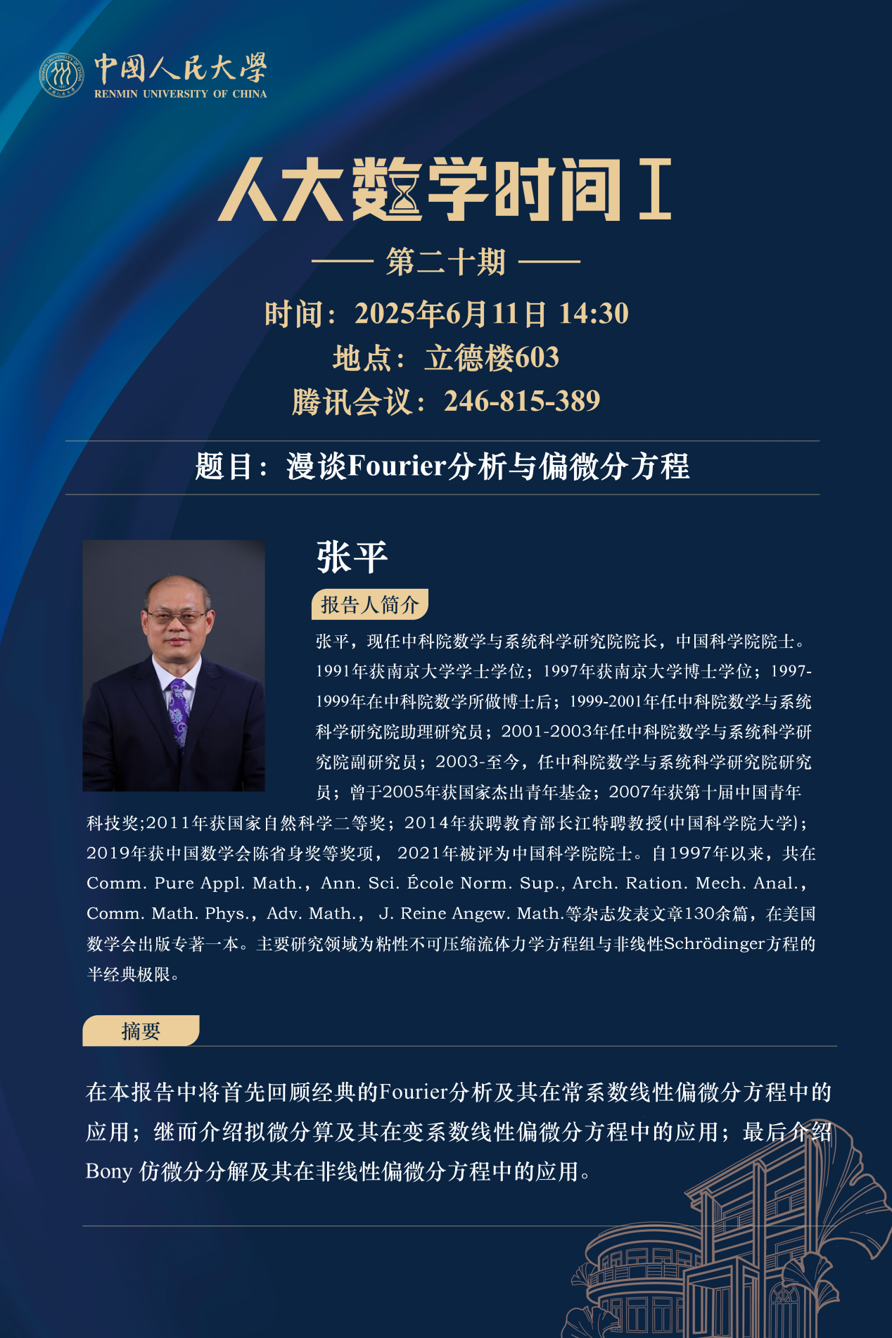 为促进学科交流融合、拓宽师生学术视野、释放科研创新活力,助力人大数学学科走向一流,伟德victor1946网站设立“人大数学时间”,以专题研讨、高端学术论坛为载体,搭建数学思想充分碰撞、优秀人才不断涌流、创造活力竞相迸发的舞台。“人大数学时间”将持之以恒,久久为功,立志通过交流与创新、提出重大问题,引领数学学科及相关领域的创新与发展,成为对我国数学发展有贡献意义的平台。以下为“人大数学时间I”第二十期信息: