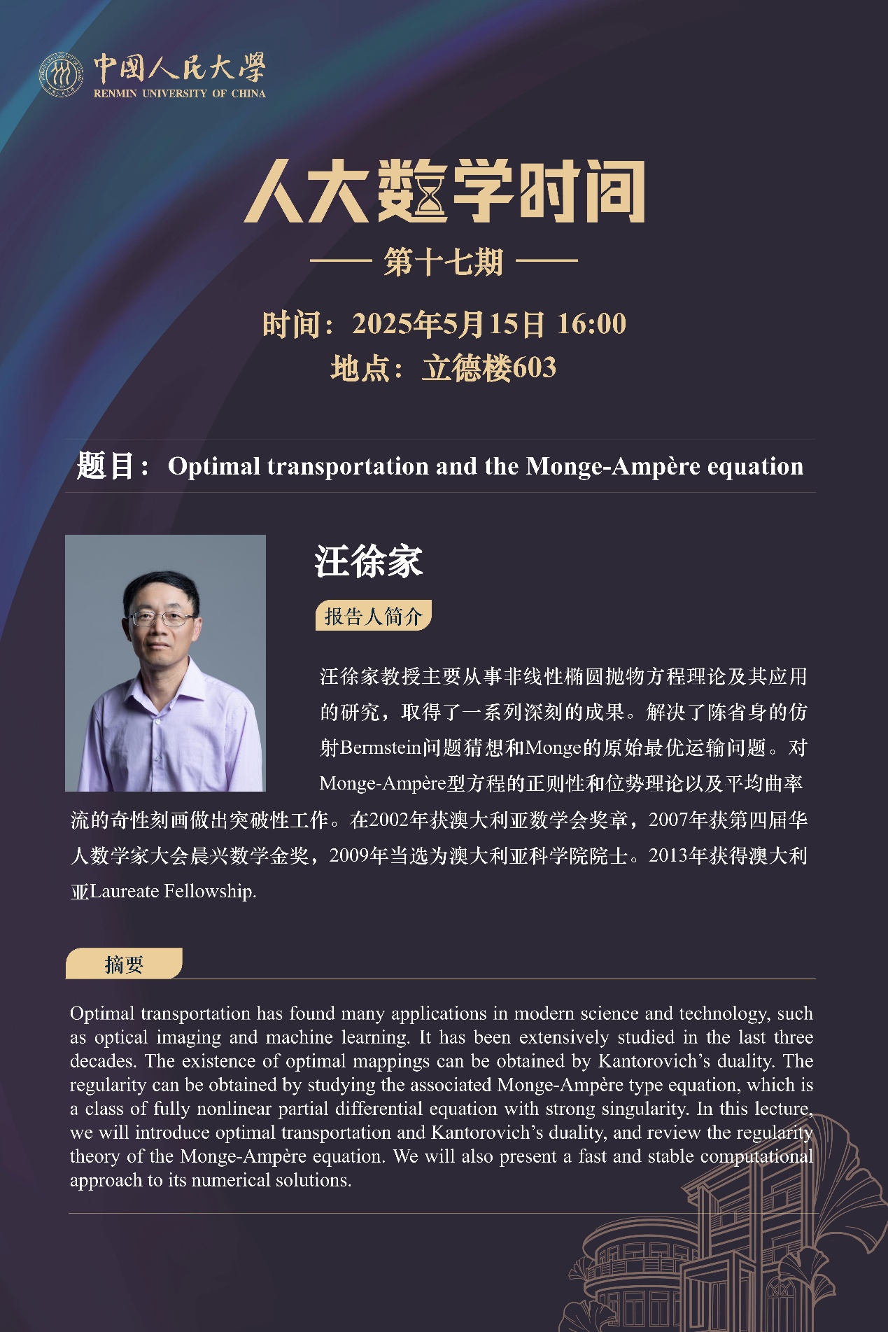 为促进学科交流融合、拓宽师生学术视野、释放科研创新活力,助力人大数学学科走向一流,伟德victor1946网站设立“人大数学时间”,以专题研讨、高端学术论坛为载体,搭建数学思想充分碰撞、优秀人才不断涌流、创造活力竞相迸发的舞台。“人大数学时间”将持之以恒,久久为功,立志通过交流与创新、提出重大问题,引领数学学科及相关领域的创新与发展,成为对我国数学发展有贡献意义的平台。以下为“人大数学时间I”第十七期信息: