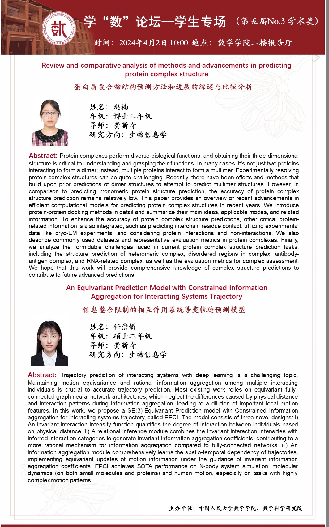 任崇娇同学师从公司龚新奇老师,主要研究方向是生物信息学。本次报告题目为《信息整合限制的相互作用系统等变轨迹预测模型》,