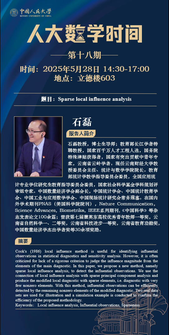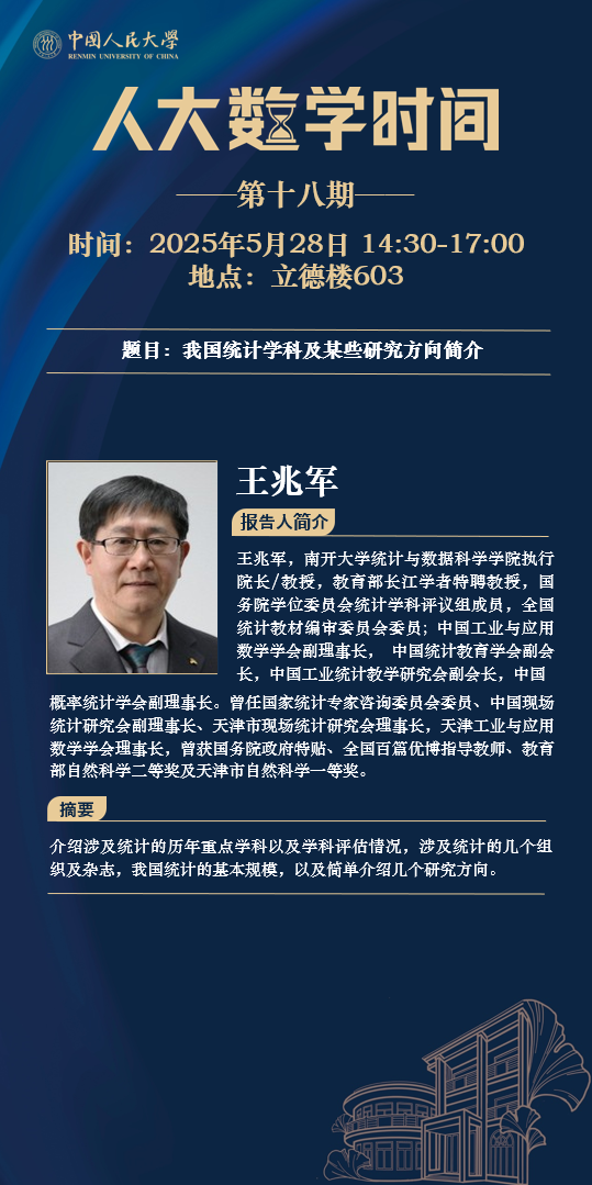 为促进学科交流融合、拓宽师生学术视野、释放科研创新活力,助力人大数学学科走向一流,伟德victor1946网站设立“人大数学时间”,以专题研讨、高端学术论坛为载体,搭建数学思想充分碰撞、优秀人才不断涌流、创造活力竞相迸发的舞台。“人大数学时间”将持之以恒,久久为功,立志通过交流与创新、提出重大问题,引领数学学科及相关领域的创新与发展,成为对我国数学发展有贡献意义的平台。以下为“人大数学时间I”第十八期信息: