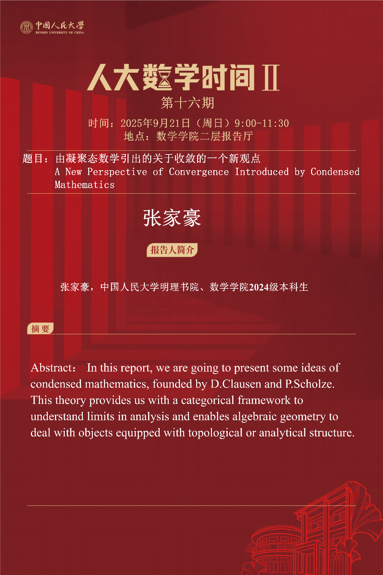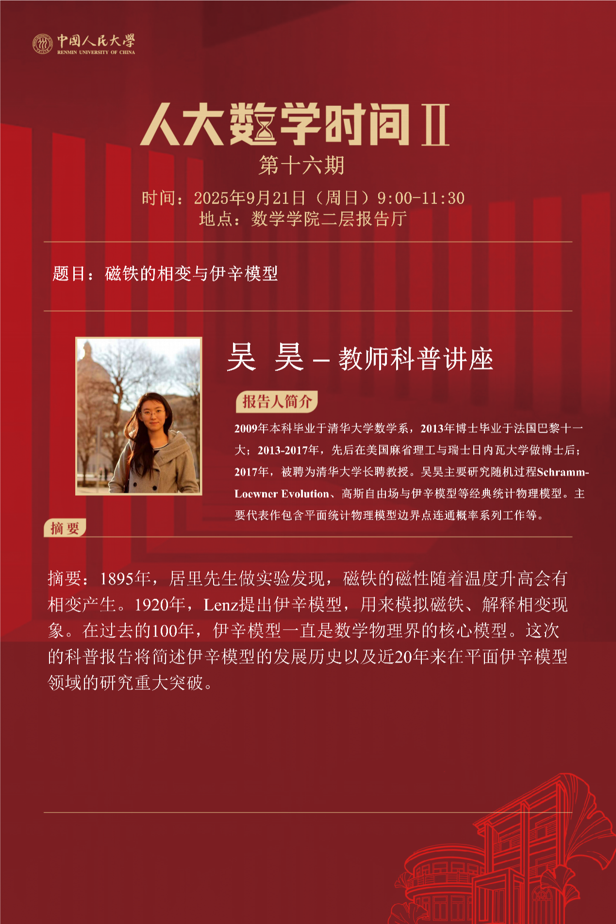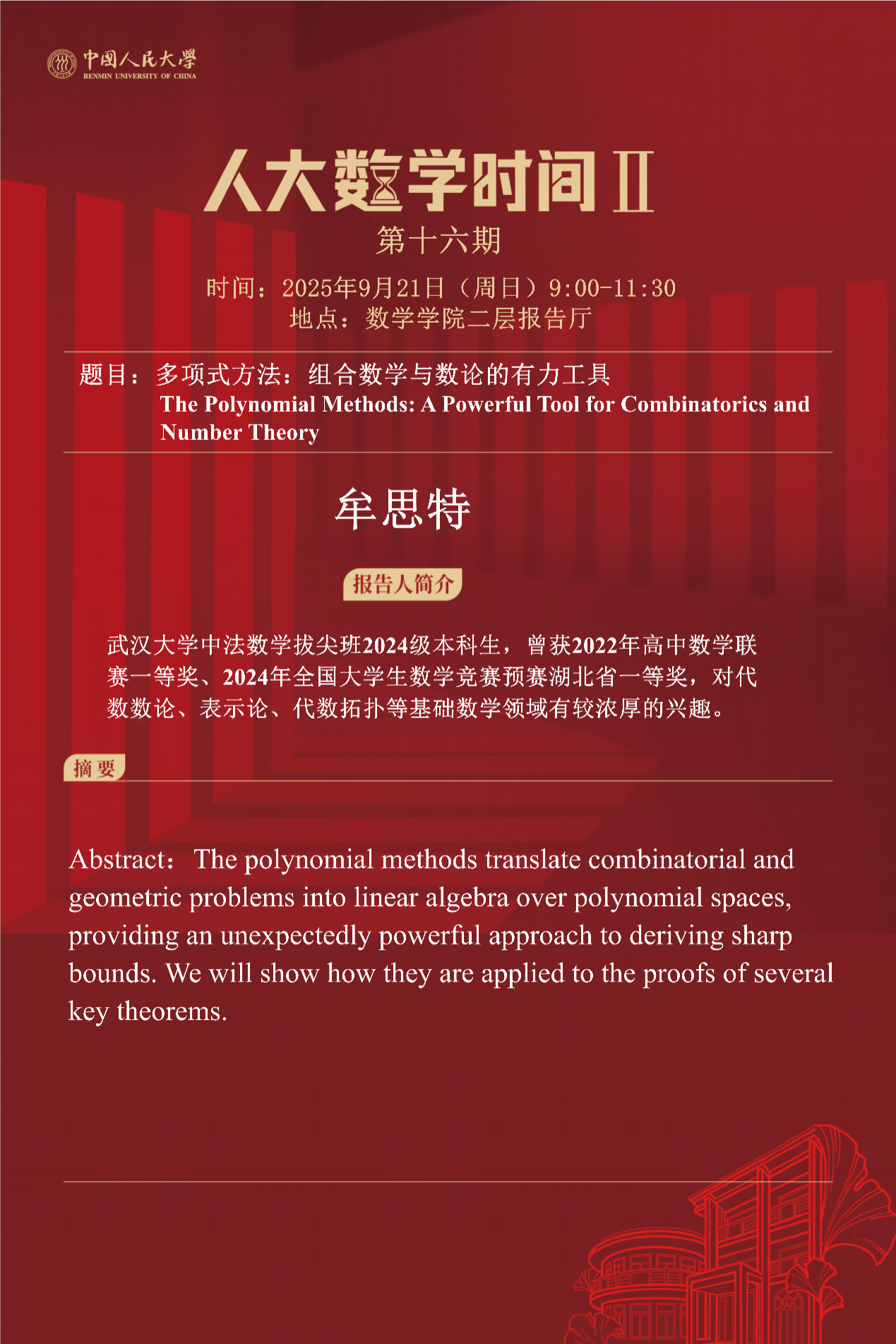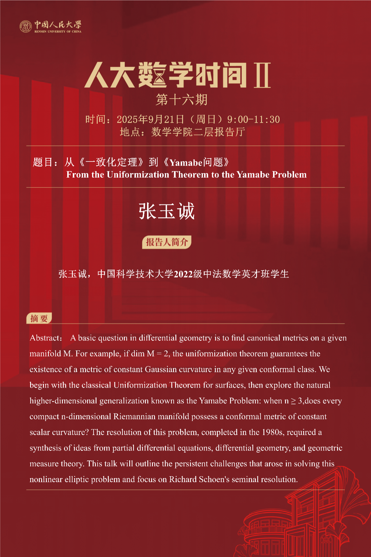 为促进学科交流融合、拓宽师生学术视野、释放科研创新活力,助力人大数学学科走向一流,伟德victor1946网站设立“人大数学时间”,以专题报告、交流研讨、高端学术论坛为载体,搭建数学思想充分碰撞、优秀人才不断涌流、创造活力竞相迸发的舞台。“人大数学时间”将持之以恒,久久为功,立志通过交流、创新、提出重大问题,引领数学学科及相关领域的创新与发展,成为对我国数学发展有贡献意义的平台。