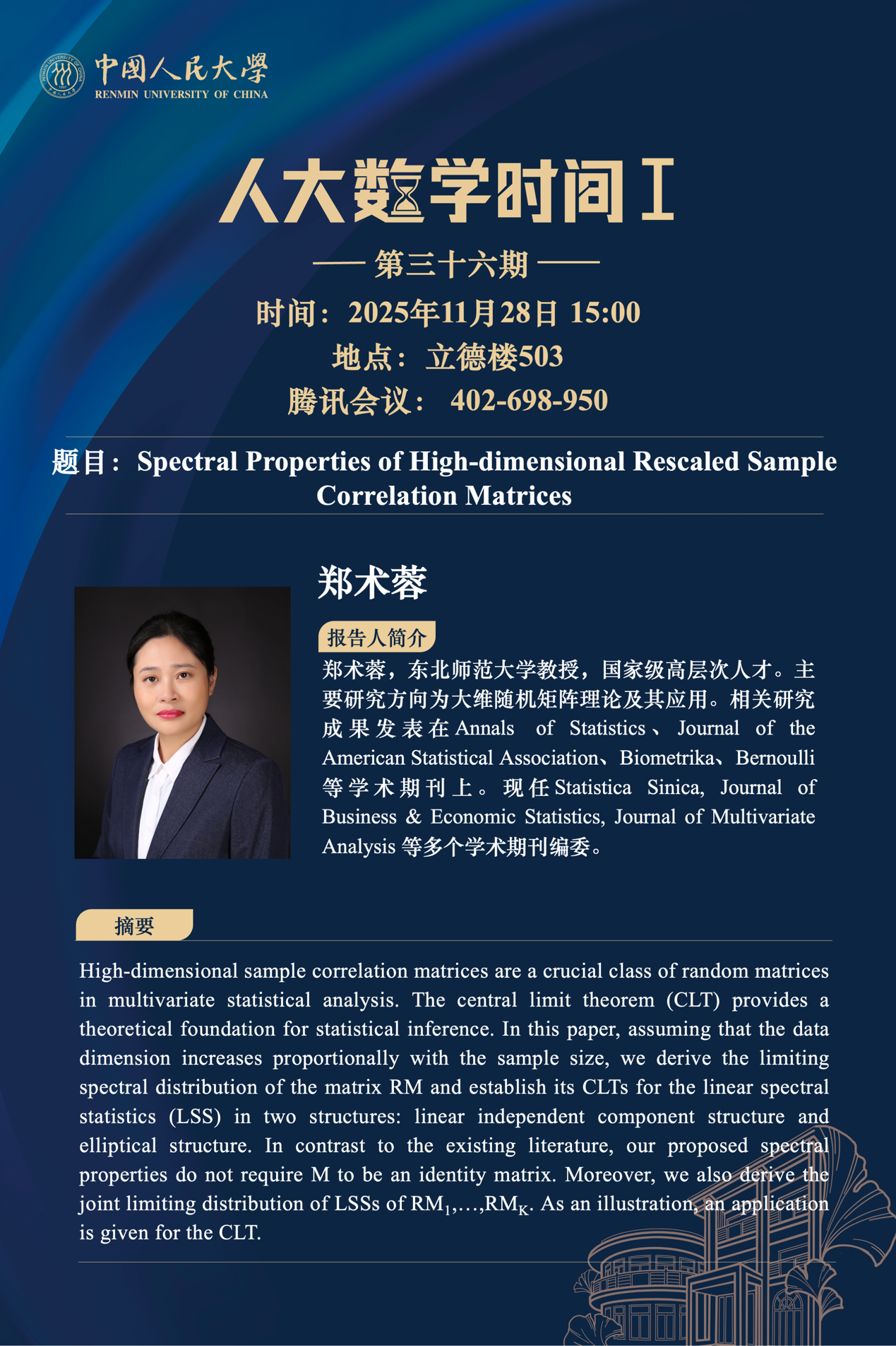 为促进学科交流融合、拓宽师生学术视野、释放科研创新活力,助力人大数学学科走向一流,伟德victor1946网站设立“人大数学时间”,以专题研讨、高端学术论坛为载体,搭建数学思想充分碰撞、优秀人才不断涌流、创造活力竞相迸发的舞台。“人大数学时间”将持之以恒,久久为功,立志通过交流与创新、提出重大问题,引领数学学科及相关领域的创新与发展,成为对我国数学发展有贡献意义的平台。以下为“人大数学时间I”第三十六期信息: