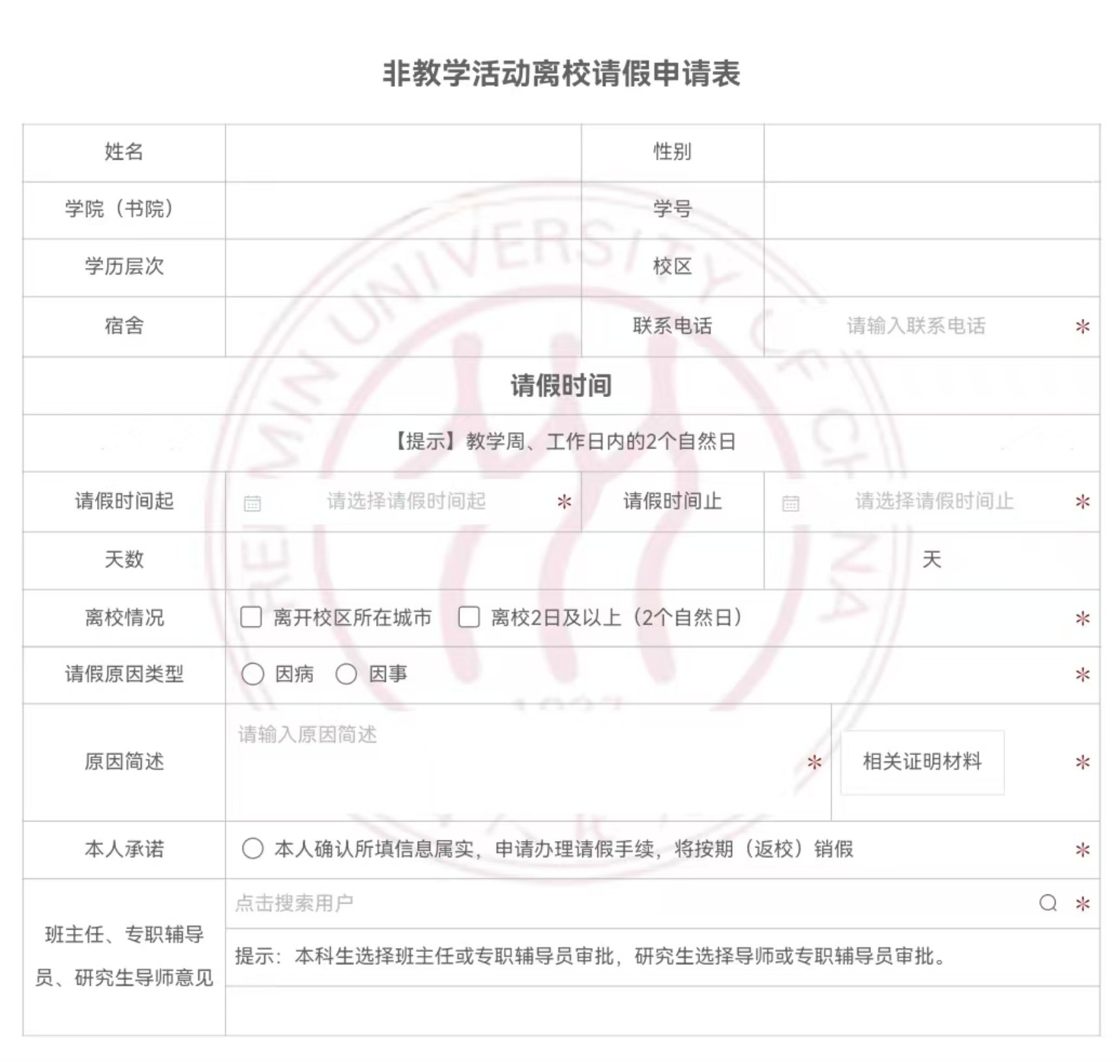 4.如同一原因需要同时办理教学活动和非教学活动请假,均需单独提交请假申请。未按要求办理请假手续或请假未获批准而擅自不参加教学活动、在教学周(不含国际小学期)内擅自离校的,将按规定给予相应纪律处理。