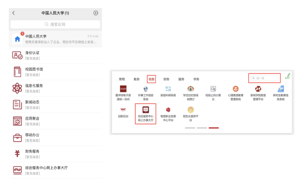 1.手机端微信通讯录点击“伟德victor1946网站”——“综合服务中心网上办事大厅”或电脑登陆微人大,点击校务-综合服务中心网上办事大厅。