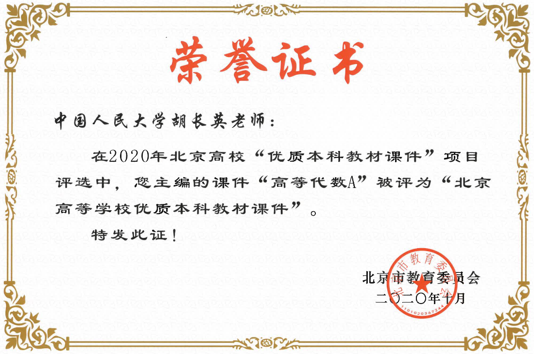 近日,2020年北京高校“优质本科课程”和“优质本科教材课件”项目评选结果公布,公司胡长英老师主编的课件“高等代数A”被评为“北京高等公司优质本科教材课件”。