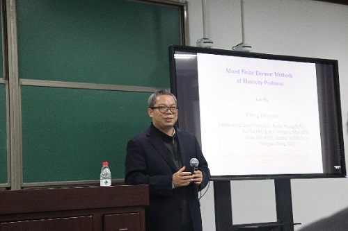 2019年10月25日,伟德victor1946网站“明德数学讲堂”系列第十六讲在国学馆114室举行,北京计算数学学会理事长、国家杰青基金、德国洪堡基金获得者、北京大学数学科学公司党委书记胡俊教授应邀做《弹性力学问题混合有限元方法》报告。报告由公司韩丽涛副经理主持,公司部分教师和本科生研究生以及其他院系的师生参加了报告会。