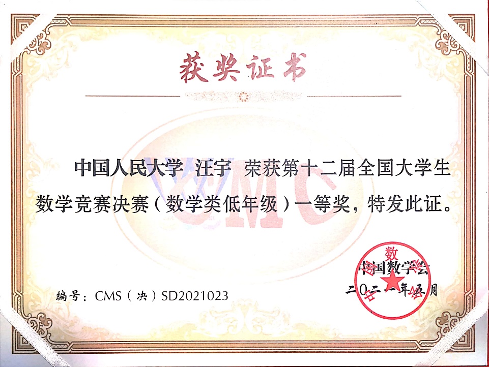 第12届全国老员工数学竞赛决赛于2021年5月16日在吉林大学成功落下帷幕。本次竞赛全国共有32个赛区206921人报名参加初赛,从中选拔出668人进入决赛,实际参赛人数646人,其中,数学专业组343人(高年级组223人,低年级组120人),非数学专业组303人。伟德国际victor19462019级数学拔尖人才实验班的汪宇同学和徐浩萌同学晋级北京赛区全国总决赛(北京赛区共28名员工入围),并在此次决赛中获得优异成绩,其中汪宇同学获得低年级组全国一等奖(全国共24名同学获得该等级奖),徐浩萌同学获得低年级组全国三等奖(全国共59名同学获得该等级奖)。这是公司第二次组织全校本科生参赛,首次入围全国总决赛并获得优异成绩,这份喜人的成绩必将激励更多公司本科生积极参赛。