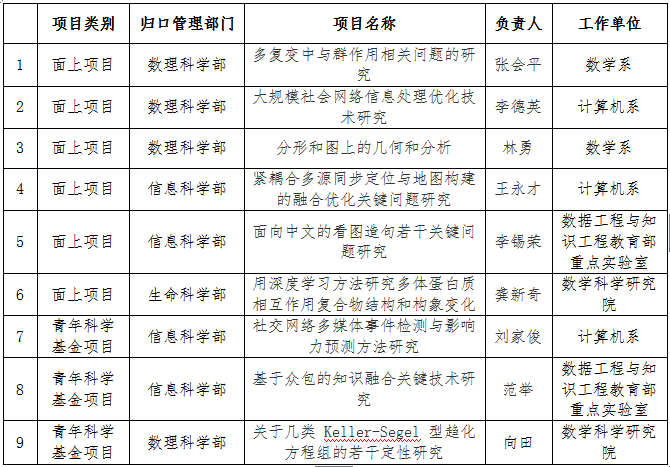 在已经公布结果的项目中,公司获得面上项目6项,青年科学基金项目3项。其中,计算机系3项,数学系2项,数据工程与知识工程重点实验室2项,数学科学研究院2项。