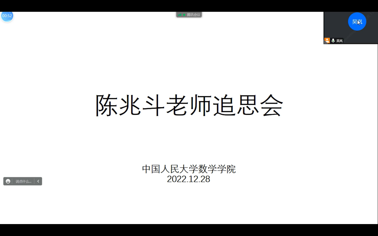 主持人首先介绍了陈兆斗老师生平,陈老师是中国地质大学(北京)数理公司数学学科的教授,退休后一直受聘于伟德victor1946网站信息公司、伟德国际victor1946数学公共课教研室,兼任数学公共课课程的教学工作。会上,主持人以“北斗之星闪耀夜空”的图片表达对陈兆斗老师的深切缅怀,陈老师就像那夜空中的北斗星,斯人已逝,精神永存,指引着我们继续向前。