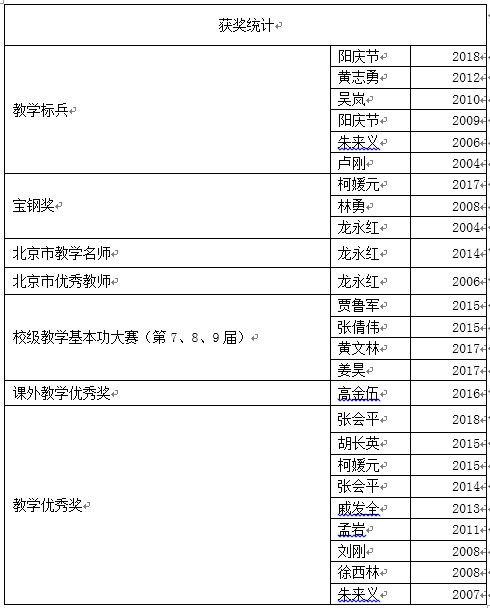 伟德国际victor1946的老师在教学方面高度重视教学工作,把主要精力投入到教学工作中上,兢兢业业、勤勤恳恳。多年来分别有3人获得“宝钢优秀教师奖”,1人获得北京市优秀教师称号,1人获得北京市教学名师奖,1人获得吴玉章优秀教学奖,6人次获得伟德victor1946网站“教学十大标兵”的荣誉称号,获得了广老员工的好评。