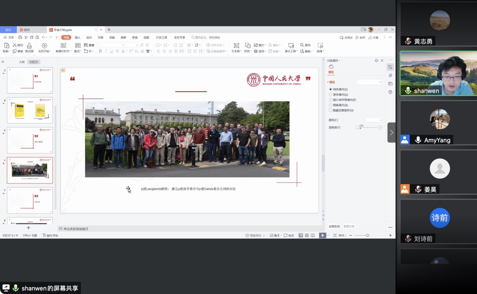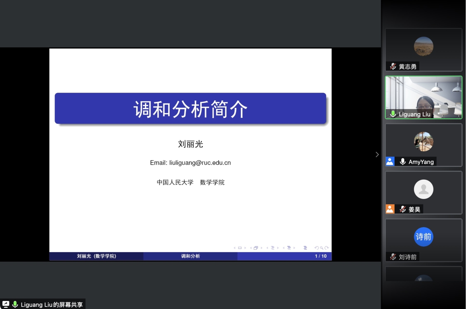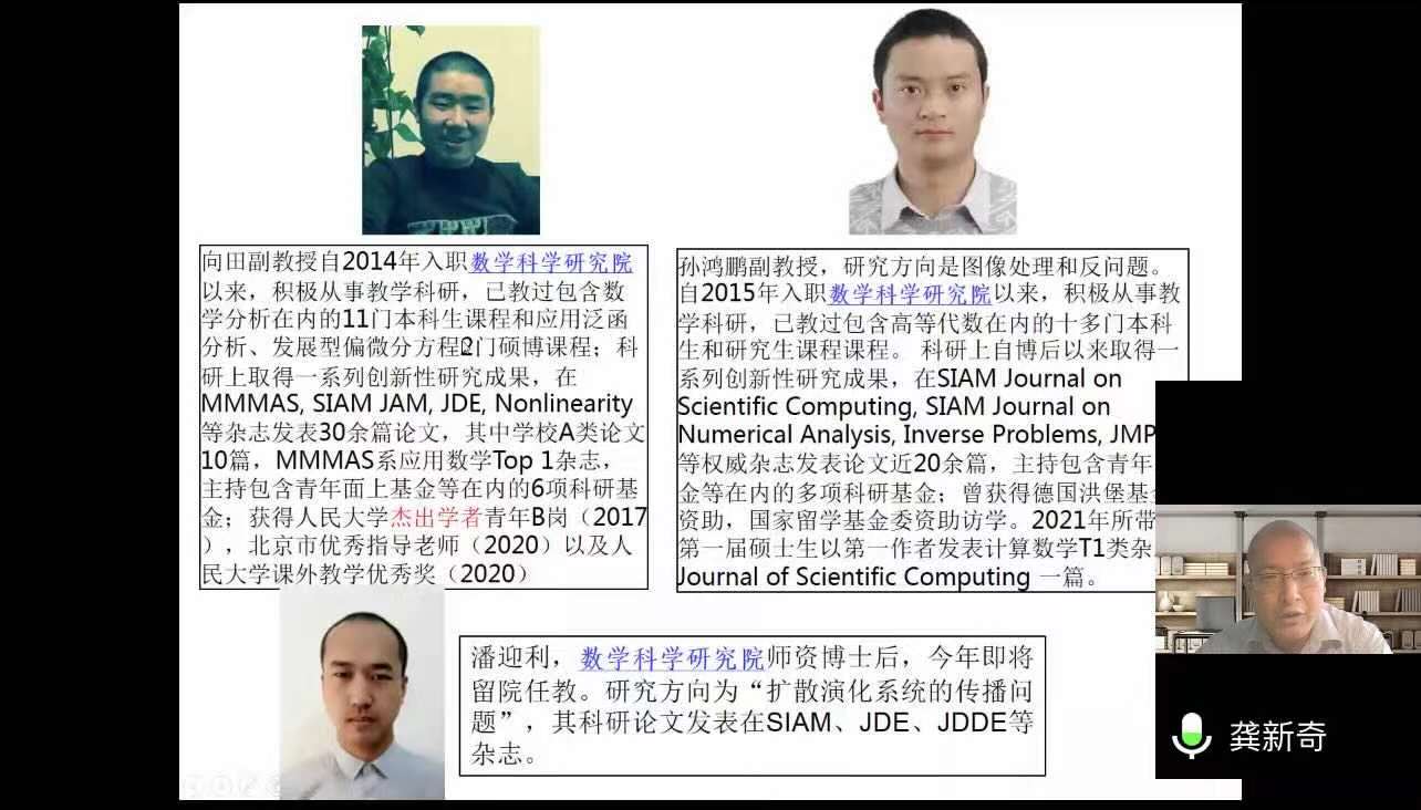 之后,各位老师依次介绍了人大数学学科的研究方向和领域。欧耀彬教授介绍了流体力学方向的相关研究;龚新奇教授介绍了生物数学方向与数学科学研究院的研究团队与研究内容;刘丽光教授针对调和分析方向做了详细介绍;王善文副教授就代数方向分享了独到见解并鼓励同学们努力做一名终身学习者;郑涛副教授介绍了复几何和复流形方向的研究进展;杨云雁教授期待大家能够在偏微分方程方向上快速进入状态并做出贡献;张庆彩教授介绍了以黎曼猜想为代表的复变函数方向;王伟教授就控制论方向做出了精彩的阐述,欢迎同学们加入伟德国际victor1946共同探索数学的魅力。